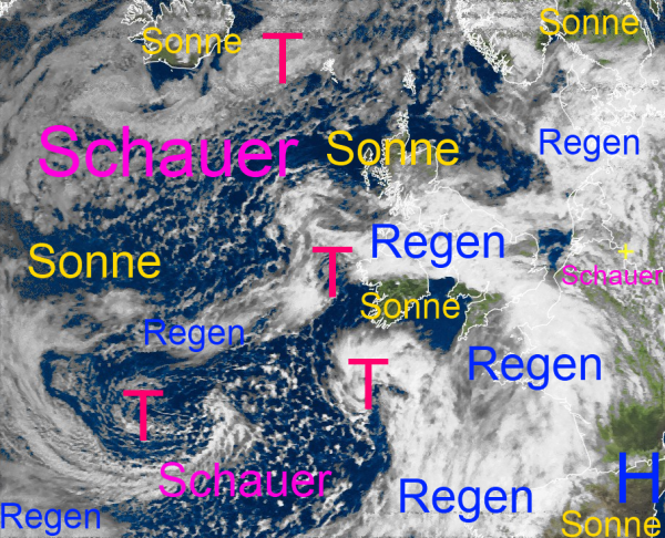 Über dem Atlantik haben sich mehrere kleinere Tiefdruckwirbel gebildet die mit ihren Regen- und Schauerwolken Richtung Mitteleuropa steuern und in den kommenden Tagen der ausgetrockneten Vegetation den nötigen Niederschlag bescheren werden.
