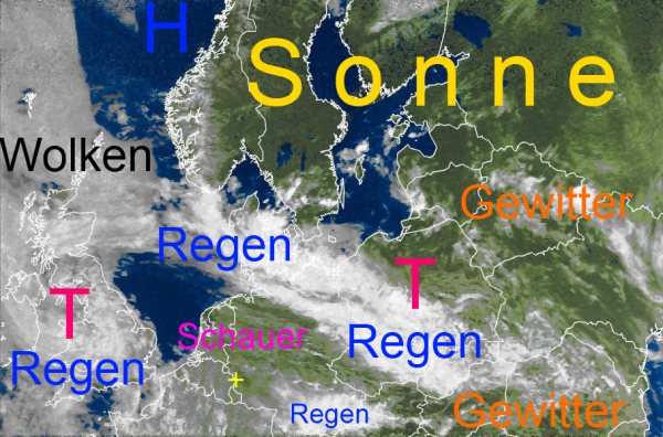 Weitere Regenwolken erkennt man über dem Süden unseres Landes, sowie im Bereich des Tiefs bei den Britischen Inseln.