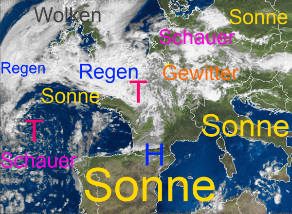In der schwül-warmen Luftmasse halten sich über Mitteleuropa mächtigere Schauercluster. Mit etwas sonniger Einstrahlung bilden sich im Tagesverlauf auch wieder kräftige Gewitter mit der Gefahr von Starkregen, Hagelschlag, sowie kleinräumigen Überschwemmungen.