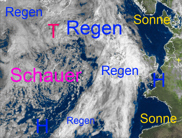 Über dem Nordatlantik hat sich ein mächtiges Tiefdruckgebiet gebildet. Seine Regenwolken haben bereits die Britischen Inseln erreicht und wandern morgen im Tagesverlauf auch in den Nordwesten und Norden von Deutschland. Im Vorfeld dieses Tiefs wird warme Spätsommerluft in den Süden und Südwesten unseres Landes gepumpt.