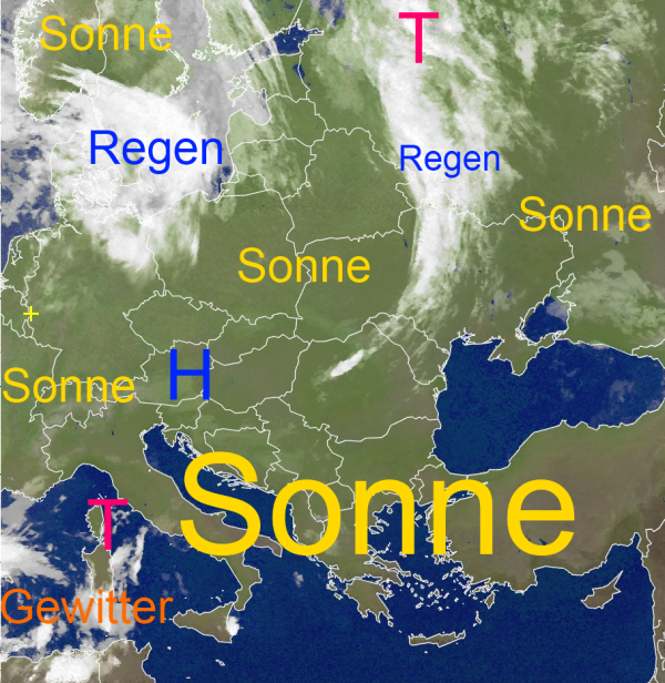 Abgesehen einiger Wolkenzonen mit regionalen Regenfällen strahlt über weiten Teilen des Europäischen Kontinentes, sowie im südlichen und östlichen Mittelmeerbereich die Sonne vom blauen Himmel.