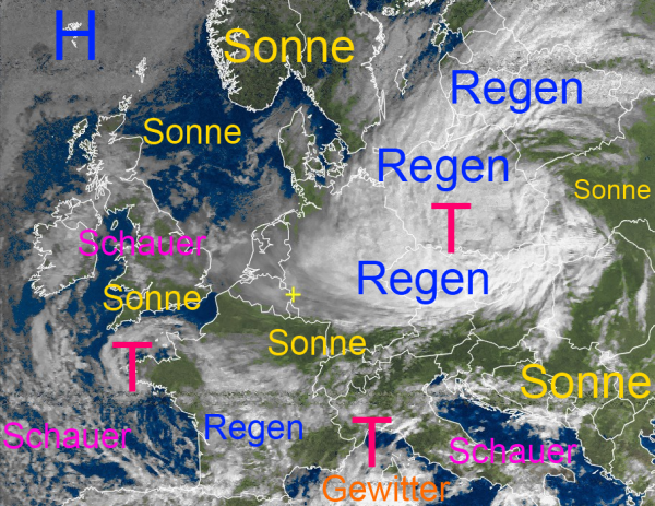 Das Tief über Südpolen schickt seine Wolken bis weit nach Deutschland hinein. Über Sachsen fielen schon zum Teil über 50 Liter Regen pro Quadratmeter.