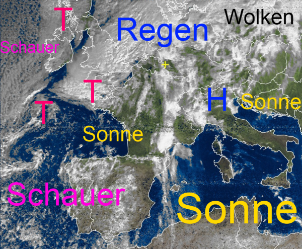 Hinter den im Norden angelangten Regenwolken gelangt mit südwestlichen Winden nochmals warme Luft nach Mitteleuropa. Dagegen strömt auf der Rückseite der Tiefs bei den Britischen Inseln kältere Polarlurft weit nach Süden, zu erkennen an der schuppenförmigen Schauerbewölkung.