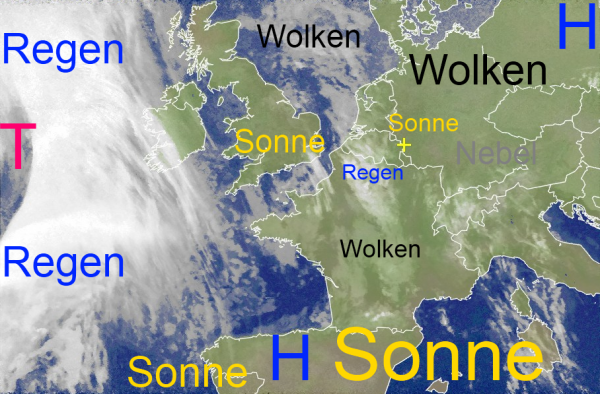 Über dem Atlantik erkennt man ein markantes Wolkenband mit Regen. Es wird morgen und in der Nacht zu Donnerstag langsam die Britischen Inseln überqueren und unter Abschwächung den Westen und Nordwesten unseres Landes erreichen.