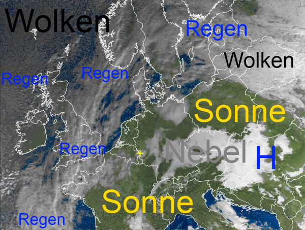 Aus dem von Norwegen, über die Nordsee und England, bis zur Biskaya verlaufenden Wolkenband fällt zum Teil Regen. Diese Front wird sich auf ihrem Weg Richtung Mitteleuropa jedoch weiter abschwächen.