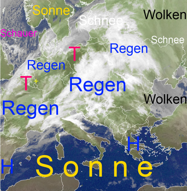Über weiten Teilen Mitteleuropas erkennt man dichte Wolken mit Regen, über dem Baltikum, sowie über der Ukraine und Russland auch gelegentlich Schnee oder Schneeregen.