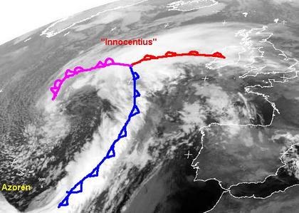 Der Ausschnitt des Satellitenbildes von Donnerstag früh zeigt das neue Sturmtief 'Innocentius' über dem Atlantik. In der Hinter seiner Kaltfront werden kühlere Luftmassen polaren Ursprungs herangeführt in der sich viele Schauer bilden. Ein Teil dieser Schauer zieht heute über die Azoren hinweg.