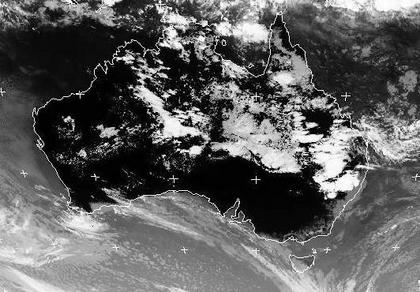 Auf dem Satellitenbild von Montag früh sind Schauer- und Gewitterzellen über dem Zentrum, aber vor allem auch im Osten von Australien gut zu erkennen. Die Hochreichenden, und damit kalten Wolkenoberkanten (im Infrarotbild weiß dargestellt) heben sich stark vom warmen Erdboden ab (im Infrarotbild schwarz dargestellt).