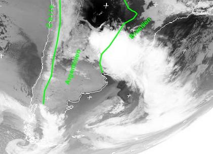 Auf dem Foto ist im äußersten Süden Brasiliens und im Osten Argentiniens ein dichtes Wolkenpaket zu erkennen. Hierbei handelt es sich um vielfach hochreichende Cumulonimbusbewölkung, die für zahlreiche Gewitter mit teils extremen Niederschlägen verantwortlich ist.