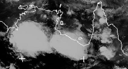 Im Norden Australiens, zwischen Queensland und Northern Territory, haben sich Dienstag Nachmittag (Ortszeit) kräftige Gewitterzellen gebildet. Ihre tellerförmige Struktur lässt darauf schließen, dass es sich um Luftmassengewitter handelt, die in der hier sehr heißen Luft (über 40 Grad) entstanden sind. Örtlich bringen diese Gewitter Regenmengen von über 50 Liter. (Bildquelle: NERC Satellite Receiving Station, Dundee University, Scotland, http://www.sat.dundee.ac.uk/)