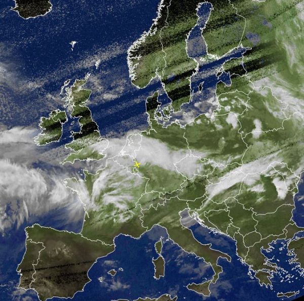 Das Satellitenfoto von heute Nachmittag zeigt den Süden Europas verbreitet wolkenlos oder nur leicht bewölkt. Von West- über Mittel- bis nach Osteuropa erstrecken sich dagegen verbreitet dichte Wolken, darunter fällt insbesonders von den Benelux-Staaten bis nach Deutschland hinein oft starker und teils ergiebiger Regen.