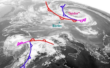 Das Satellitenbild vom Mittwochmorgen zeigt zwei Tiefdruckgebiete. Der eine von Ihnen mit dem Namen 'Isidor' liegt über dem Baltikum (man erkennt es sehr gut an einer Wolkenspirale). Das zweite Tief bringt heute Abkühlung auf der Iberischen Halbinsel. Zwischen den beiden Tiefs erstreckt sich von Frankreich bis zum Balkan und dem Schwarzen Meer eine Hochdruckzone und sorgt für lockere Bewölkung.