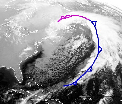 Der Ausschnitt zeigt ein Sturmtief über dem nordwestlichen Atlantik. Entlang der kanadischen Küste von Neufundland bis nach Nova Scotia bringt es teils kräftige Schneefälle und Schneeschauer bei stürmischem Wind. Die Kaltfront des Tiefs erstreckt sich von seinem Zentrum bis zu den Bahamas, auf ihrer Rückseite haben sich in kalter Luft mehrere Schauerwolken entwickelt.