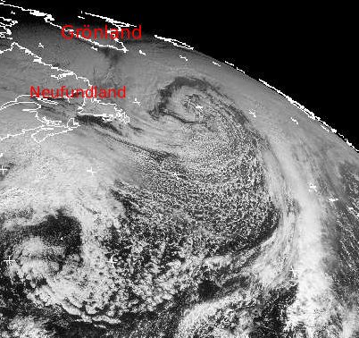 Südöstlich von Grönland liegt am Montag Mittag das gut ausgebildete Sturmtief 'Geoffrey'. In der Bewölkung zeigt sich in das Zentrum hinein eine Spirale, was ein Zeichen für eine beginnende Okkludierung ist. Rückseitig der Front ist am 'Flickenteppich' der Bewölkung eine ausgeprägte Schauerstaffel auszumachen. 'Geoffrey' zieht nun rasch nach Südosten und damit auf Mitteleuropa zu. Damit bleibt es auch in Deutschland wechselhaft und windig. (Bildquelle: NERC Satellite Receiving Station, Dundee University, Scotland, http://www.sat.dundee.ac.uk/)