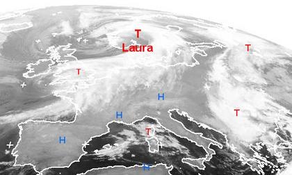 Das sich nur sehr langsam bewegende Sturmtief 'Laura' über Skandinavien sorgt heute in weiten Teilen Nord- und Westeuropas für teils länger andauernden Regen. Besonders ergiebig regnet es im Osten Englands, in den Niederlanden und in Nordwestdeutschland. Örtlich werden innerhalb von 24 Stunden über 50 Liter Regen prognostiziert. Von der Iberischen Halbinsel über Südfrankreich, den Alpen und Italien sorgt dagegen Hochdruckeinfluss für freundliches und überwiegend trockenes Wetter. Ein ausgedehntes Tief westlich des Schwarzen Meers sorgt für besonders in Rumänien und Bulgarien für zahlreiche Niederschläge.
