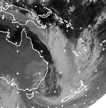 Vor der Westküste Neuseelands liegt ein ausgeprägtes Tiefdrucksystem, dessen Wolken über Neukaledonien bis nach Papua-Neuguinea und an die Südostküste von Australien reichen. In seinem Bereich kommt es zu teils ergiebigen Niederschlägen und Sturm. Das Tief wandert in den nächsten Tagen langsam nach Osten weiter und zieht dann auch über Neuseeland hinweg. (Bildquelle: NERC Satellite Receiving Station, Dundee University, Scotland, http://www.sat.dundee.ac.uk)