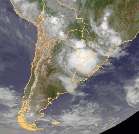 Auf dem Satellitenbild vom südlichen Teil Südamerikas ist ein kräftiges Tiefdrucksystem über großen Teilen Uruguays und Paraguays zu erkennen. Hierbei kommt es in einigen Regionen zu teils kräftigen und sehr ergiebigen Niederschlägen. In den meisten anderen Gebieten vom südlichen Südamerika kommt es nur zeitweise zu Schauern oder einzelnen Gewittern.