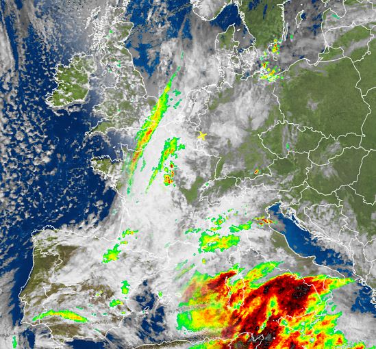 Auf dem Satellitenbild von heute Nachmittag sind über dem westlichen Europa verbreitet viele und oft dichte Wolken zu erkennen. Über dem zentralen Mittelmeerraum sorgt ein ausgeprägtes Tiefdrucksystem mit seinen Ausläufern für zahlreiche und oft kräftige Schauer und sogar Gewitter.
