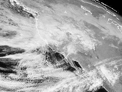 Über dem Westen der USA liegt ein Tief, das vor allem in Kalifornien teils kräftigen Regen bringt. Im Bergland schneit es auch. Am Montag verlagert sich das Tief weiter nach Osten und bringt in den USA verbreitet Regen, während er in Kalifornien nachlässt, dort strömt dann jedoch von Norden kühle Luft ein. (Bildquelle: NERC Satellite Receiving Station, Dundee University, Scotland, http://www.sat.dundee.ac.uk/)