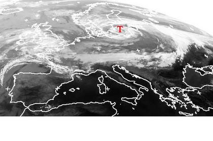 Der Wolkenwirbel über der südlichen Ostsee kennzeichnet das Sturmtief 'Birgit', das Gestern über Deutschland hinweg gezogen ist. Seine Ausläufer erstrecken sich vom Baltikum über Weißrussland und der Ukraine bis in den Alpenraum und sorgen dort noch gebietsweise für Regen. Südlich dieses Ausläufers ist es unter Hochdruckeinfluss meist freundlich und trocken. (Bildquelle: NERC Satellite Receiving Station, Dundee University, Scotland, http://www.sat.dundee.ac.uk/)