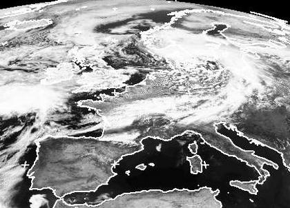Das Sturmtief 'Birgit' liegt mit seinem Zentrum über Südschweden. Ein Ausläufer des Tiefs mit dichten Wolken hat Deutschland schon überquert. Das Wolkenband erstreckt sich auf dem Satellitenbild vom Montagmittag vom Baltikum bis zu den Alpen. Auf seiner Rückseite strömt von Nordwesten eher kühle Luft nach Mitteleuropa. In dieser Luftmasse haben sich lockere Quellwolken, teils auch mit Schauern oder Gewittern, gebildet.