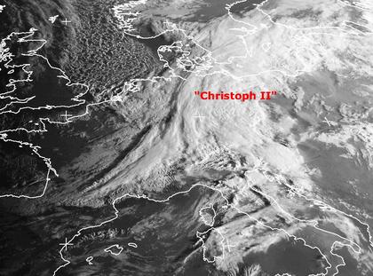 Die Wolken von Tief 'Christoph II' über Polen erstrecken sich am Donnerstag morgen von dem Baltikum über den Norden Polens bis nach Südfrankreich. Hieraus regnet es teils kräftig. Auf der Rückseite hat sich über der Nordsee Schauerbewölkung formiert, die man an der zerfransten Struktur gut erkennen kann. Sie zieht am Nachmittag auch in den Nordwesten Deutschlands. Von den Britischen Inseln bis nach Nordfrankreich sind die Wolken dagegen seltener, hier macht sich ein Keil des Hochdruckgebietes über dem Atlantik bemerkbar. (Bildquelle: NERC Satellite Receiving Station, Dundee University, Scotland, http://www.sat.dundee.ac.uk/)