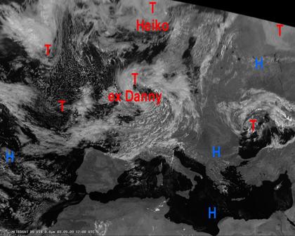 Auf dem heutigen Satellitenfoto zeigt sich der Mittelmeerraum und der Nordosten und Osten Europas, mit Ausnahme eines Tiefdruckgebiets nördlich des Schwarzen Meeres, weitgehend heiter und daher meist trocken. Dagegen bringt das ausgeprägte Tief 'ex Danny' über den Britischen Inseln vielfach feuchte Luftmassen mit Schauern und teils auch Gewittern bis nach Mitteleuropa. Im Norden Europas sorgt ein weiteres Tief 'Heiko' für einige Schauer.