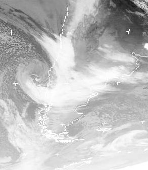 Über Südchile erkennt man der Wolkenwirbel eines Tiefs, das hier Regen, Schnee und Wind bringt. Es zieht weiter nach Südargentinien, wo ebenfalls Regen fällt und straker Wind zu erwarten ist.
