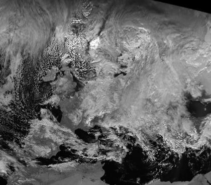 Auf dem Satellitenbild sind über Ost- und Mitteleuropa die Wolken des Tiefs 'Keziban' erkennbar, das auch weiten Teilen Deutschlands starke Schneefälle brachte. Über der Nordsee ist zelluläre Bewölkung auf der Rückseite von Tief 'Lali' zu sehen, das sich mit seinem Zentrum über der Westküste der Skandinavischen Halbinsel befindet.