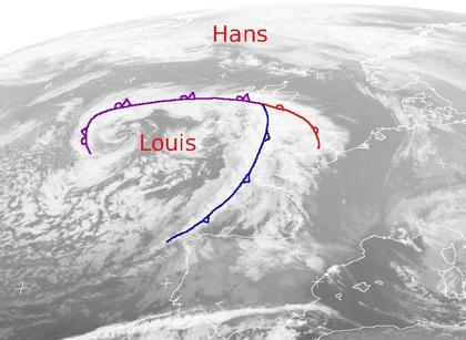 Das Satellitenbild von heute früh zeigt das Tief 'Louis' mit seinen Ausläufern über Großbritannien. Es sorgt für einigen Regen und viel Wind über den Britischen Inseln. Weiter nach Norden findet man noch die Restbewölkung des alten Islandtiefs 'Hans'. Über Mitteleuropa dagegen hat sichleichter Zwischenhocheinfluss eingestellt, sodass hier die Wolken seltener sind. 'Louis' wird infolge der blockierenden Wirkung des Hochs nur noch wenig nach Osten vorankommen und sich dann voraussichtlich auflösen. Deutschland wird das Tief vermutlich gar nicht erst erreichen. (Bildquelle: Copyrigt EUMETSAT, NERC Satellite Receiving Station, University of Dundee)