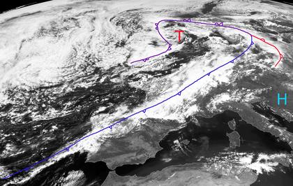 Das Tief 'Viola' mit seinem Zentrum über der Nordsee liegt mit seiner Bewölkung heute über vielen Teilen Nordwest- und Mitteleuropas. Die Kaltfront reicht dabei mit seinen Wolken bis über Spanien auf den Atlantik hinaus. Im Frontbereich kommt es zu Hebungsprozessen, weil die kalte, schwere Luft sich unter die warme und feuchte Luft schiebt, die damit angehoben wird. Damit sind beste Bedingungen für Schauer und Gewitter gegeben, die sich auch schon zahlreich gebildet haben. Erst weiter im Südosten Europas bringt Hochdruckeinfluss wolkenärmeres Wetter. (Bildquelle: Copyrigt EUMETSAT, NERC Satellite Receiving Station, University of Dundee)