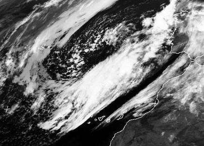 Der Ausschnitt zeigt das kleine Randtief, das sich gestern im Zuge des Kaltlufvorstoßes über dem Atlantik gebildet hat. Es ist nach Süden weitergezogen und hat sich dabei etwas verstärkt. In den nächsten Tagen wird es weiter nach Südwesten wandern sich dabei noch etwas intensivieren.