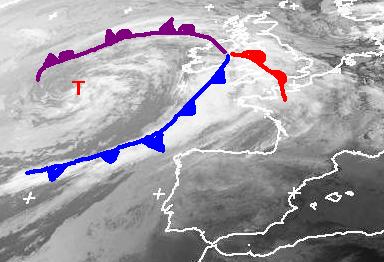 Auf dem Satellitenbild von Samstag früh ist das Tief 'Winfried' westlich der Britischen Inseln gut zu erkennen. Seine Ausläufer haben England und Irland erreicht und bringen hier teils kräftige Niederschläge. Bis morgen früh haben die Ausläufer auch Deutschland erreicht.