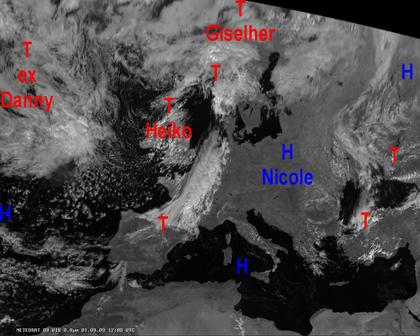 Auf dem Satellitenfoto von heute Nachmittag zeigt sich dank Hochdruckeinfluss vor allem in der Osthälfte Europas, sowie am Mittelmeer meist heiteres und trockenes Wetter. Im Westen und Norden bringen dagegen Tiefausläufer Schauer und Gewitter, sowie teils kräftigen Wind.