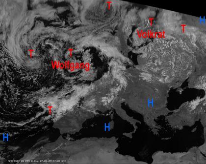 Auf dem heutigen Satellitenbild zeigt sich Tiefdruckeinfluss vom Norden der Iberischen Halbinsel, über Frankreich, Deutschland, die Ostsee bis nach Westrussland und nordwestlich davon. Hierbei herrscht überwiegend wechselhaftes Wetter mit teils kräftigen Schauern oder Gewittern vor, teils fällt auch Regen. In Süd-, Südost- und Osteuropas ist es dagegen unter Hochdruckeinfluss meist sonnig und trocken.