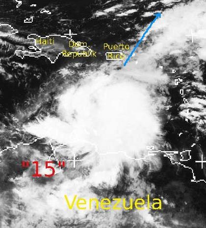 Der Tropensturm '15' hat sich vor der Küste Venezuelas gebildet und liegt über den Niederländischen Antillen. Dabei werden derzeit Windgeschwindigkeiten von 65 km/h gemessen. '15' bewegt sich nun in nordöstliche Richtung weiter und wird unter Verstärkung vor allem über Puerto Rico hinwegziehen. Hier ist neben dem Wind mit heftigen Regenfällen zu rechnen. (Bildquelle: Copyrigt EUMETSAT, NERC Satellite Receiving Station, University of Dundee)