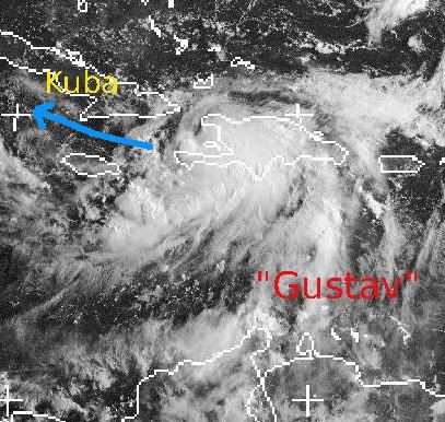 'Gustav' wurde seit gestern vom Hurrikan zum Tropensturm degradiert, da seine Windgeschwindigkeiten nur noch etwa 100 km/h im Mittel betragen. Ein Teil des Hauptwolkengebietes liegt heute Mittag über Haiti und der Dominikanischen Republik, hier kommt es teils zu ergiebigen Regenfällen. 'Gustav' zieht bis zum Ende der Woche auf südlicher Seite über Kuba hinweg und dann auf Florida zu, dabei wird er sich voraussichtlich wieder zum Hurrikan verstärken. (Bildquelle: Copyrigt EUMETSAT, NERC Satellite Receiving Station, University of Dundee)