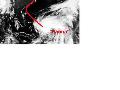 Der Tropensturm 'Hanna' liegt derzeit noch bei den Bahamas, zieht aber langsam Richtung Nordwesten. Zurzeit erreicht er mittlere Windgeschwindigkeiten von 100, in Böen um 120 km/h. Berechnungen zufolge soll er sich wieder etwas verstärken und am Freitag die Südostküste der USA erreichen. (Bildquelle: NERC Satellite Receiving Station, Dundee University, Scotland, http://www.sat.dundee.ac.uk/)