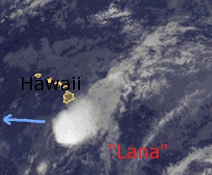 Der Tropensturm 'Lana' liegt mit seinen Wolken heute südlich von Hawaii. Seine mittlere Windgeschwindigkeit beträgt 80 km/h. 'Lana' zieht in westliche Richtung weiter, dabei streifen seine Wolken Hawaii vor allem nach Süden hin. Das Hauptgebiet des Sturms zieht voraussichtlich jedoch an den Inseln vorbei.