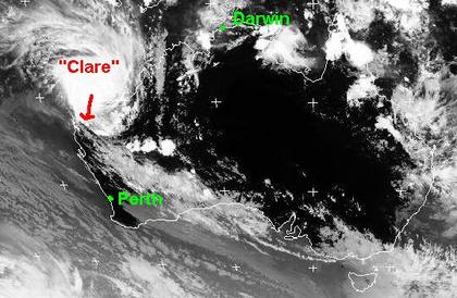 Auf dem Satellitenbild von Montag früh ist im Nordaustralischen Becken der tropischer Sturm 'Clare' gut zu erkennen. Zur Zeit zieht er mit Windgeschwindigkeiten von 110, in Böen 140 km/h nach Südwesten. Berechnungen zufolge soll er heute mit Windgeschwindigkeiten von 120, in Böen 148 km/h die Nordwestaustralische Küste nahe Port Hedland erreichen und sich über Land etwas abschwächen.