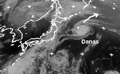 Der Ausschnitt zeigt tropischen Sturm „Danas“ östlich von Japan. Seine mittlere Windgeschwindigkeit erreicht zur Zeit 110 km/h, in Böen bis zu 140 km/h. Berechnungen zufolge bewegt sich der Sturm unter Abschwächung nach Nordosten und überquert dabei keine bewohnte Inseln.