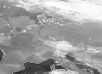 Auf den ersten Blick sieht das Satellitenbild vom Samstagmorgen nach freundlichem Wetter über Mitteleuropa aus. Doch der Schein trügt: Eine meist dichte, niedrige Hochnebeldecke erstreckt sich von Polen und Weißrussland bis zum Rhein und auf die Nordsee. Auf dem Wärmebild sind helle Töne kühler als wärmere, vor allem über der warmen Nordsee erkennt man dadurch die Wolkenfelder. Auf dem Land ist der Temperaturunterschied zum Untergrund nicht ganz so stark, sodass sich die Grautöne nur auf den zweiten Blick unterscheiden.