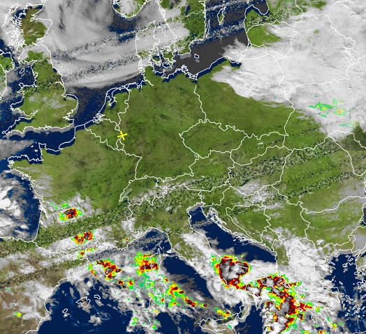 Das Satellitenfoto von heute Nachmittag zeigt weite Teile von West- über Mittel- bis nach Osteuropa wolkenlos, hier bringt Hoch "Joachim" über der Nordsee verbreitet sehr freundliches, trockenes, jedoch meist ziemlich kühles Wetter. Deutlich unbeständiger präsentiert sich das Wetter im zentralen und auch im westlichen Mittelmeer. Besonders über dem Süden Italiens, aber auch über Sardinien und Korsika entwickeln sich teils kräftige Schauer, hier und da auch einzelne Gewitter.