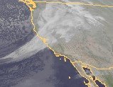 Das heutige Satellitenbild vom Westen der USA zeigt ein ausgedehntes Tiefdruckgebiet mit vielfach dichten Wolken im Nordwesten der Vereinigten Staaten. Hierbei fallen verbreitet, zum Teil kräftige, Schneefälle.