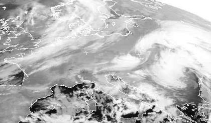 Über Süd- und Südosteuropa bleibt das Tief 'Karlheinz' mit Zentrum über dem Balkan wetterbestimmend. Wolken seines Frontensystems liegen nördlich des Schwarzen Meeres und östlich der Karpaten. Auf der Rückseite des Tiefs haben sich verbreitet Schauerwolken entwickelt. Sie sind gut von den Balearen über Italien bis nach Griechenland zu erkennen. Ein anderer Wolkenband erstreckt sich von Skandinavien entlang der Nordseeküste bis nach Bretagne; er gehört dem Frontensystem eines Tiefs über dem Polarmeer; im Tagesverlauf bringt es gelegentlich Niederschläge von Nordwestfrankreich bis zur Ostsee.