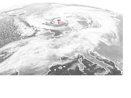Auf dem Satellitenbild von Freitag früh ist die Wolkenspirale, die sich um das Orkantief 'Resi' herumwickelt und weite Teile von Europa bedeckt, gut zu erkennen. Dieses Tief sorgt heute verbreitet für Regen oder Schnee und Sturm. Dazu gelangen auch kältere Luftmassen nach Europa. (Bildquelle: NERC Satellite Receiving Station, Dundee University, Scotland, http://www.sat.dundee.ac.uk/)