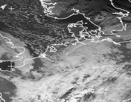 Über Deutschland zeigt das Satellitenfoto von Sonntag Mittag viele Wolken. Sie gehören zu einem Ausläufer des Tiefs 'Lukas' über Skandinavien und bringen etwas Niesel- oder Sprühregen. Über der Nordsee formiert sich dagegen schwach ausgebildete Schauerbewölkung, die in einer nordwestlich geprägten Strömung heute Nacht auch nach Deutschland einfließt und hier örtlich Schauer bringt. Südöstlich im Lee des Skandinavischen Gebirges ist es dagegen häufig wolkenlos. Diese Zone geringer Bewölkung wandert in der Strömung in den Nordosten Deutschlands, so dass es hier in der Nacht meist trocken bleibt. (Bildquelle: NERC Satellite Receiving Station, Dundee University, Scotland, http://www.sat.dundee.ac.uk/)