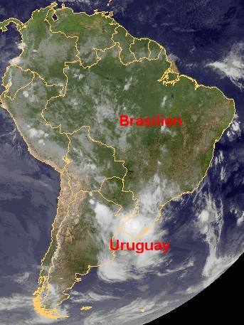 Auf dem heutigen Satellitenfoto von Südamerika sind speziell über Uruguay dichte Wolken eines Tiefdrucksystems zu erkennen. Hierbei kommt es vielfach zu kräftigem und gewittrigem Regen. Sonst ist es auf dem Kontinent weitegehend locker bewölkt oder sonnig und trocken.