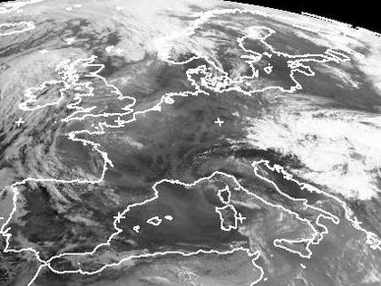 Hochdruckeinfluss sorgt von Finnland über Deutschland bis nach Frankreich für wolkenarmes Wetter. Im Nordwesten zeigen sich etwas mehr Wolken durch atlantische Tiefausläufer. Ein Tief mit ausgedehnter Bewölkung liegt über Südosteuropa. Hier kommt es Schauern und Gewittern. (Bildquelle: NERC Satellite Receiving Station, Dundee University, Scotland, http://www.sat.dundee.ac.uk/)