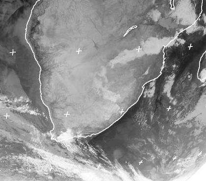 Weite Teile des südlichen Afrikas sind wolkenfrei. Nur im Osten findet man gebietsweise niedrige, teils hochnebelartige Bewölkung. Vom Südpolarmeer her nähert sich aber ein Tiefausläufer mit seinen Wolken dem südlichen Kapland. In Küstennähe wird er auch etwas Regen bringen. (Bildquelle: NERC Satellite Receiving Station, Dundee University, Scotland, http://www.sat.dundee.ac.uk/)